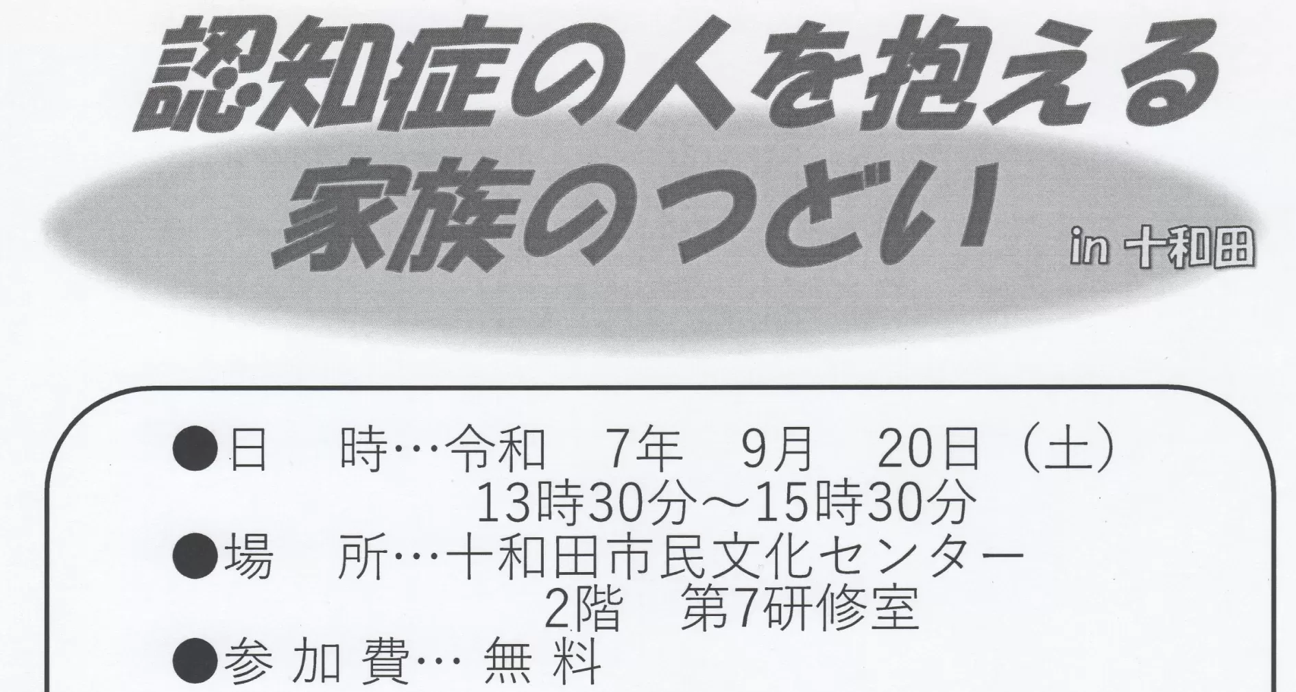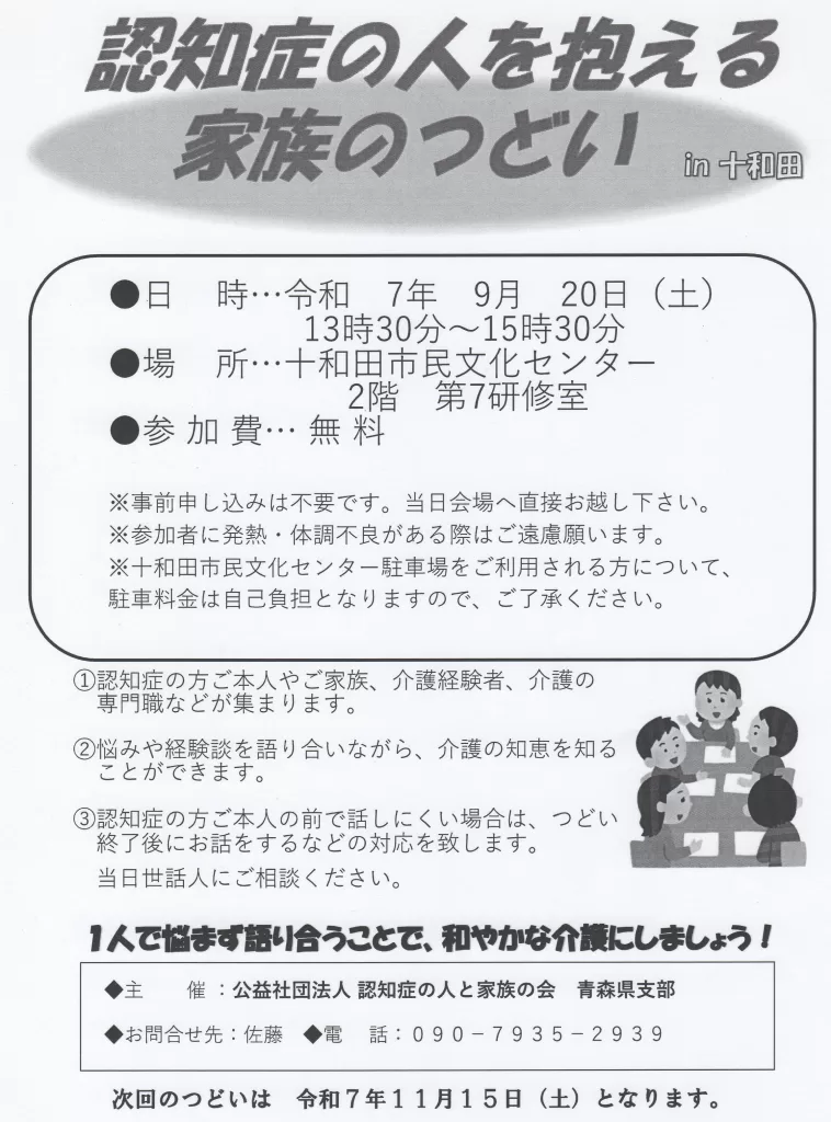 20250920 認知症の人を抱える家族のつどい in 十和田 ・過去のイベント情報 2025.08.292025.09.23 日時:2025年9月20日(土) 13:30~15:30 場所:十和田市民文化センター 2階 第7研修室 参加費:無料(駐車料金は各自自己負担をお願いします)