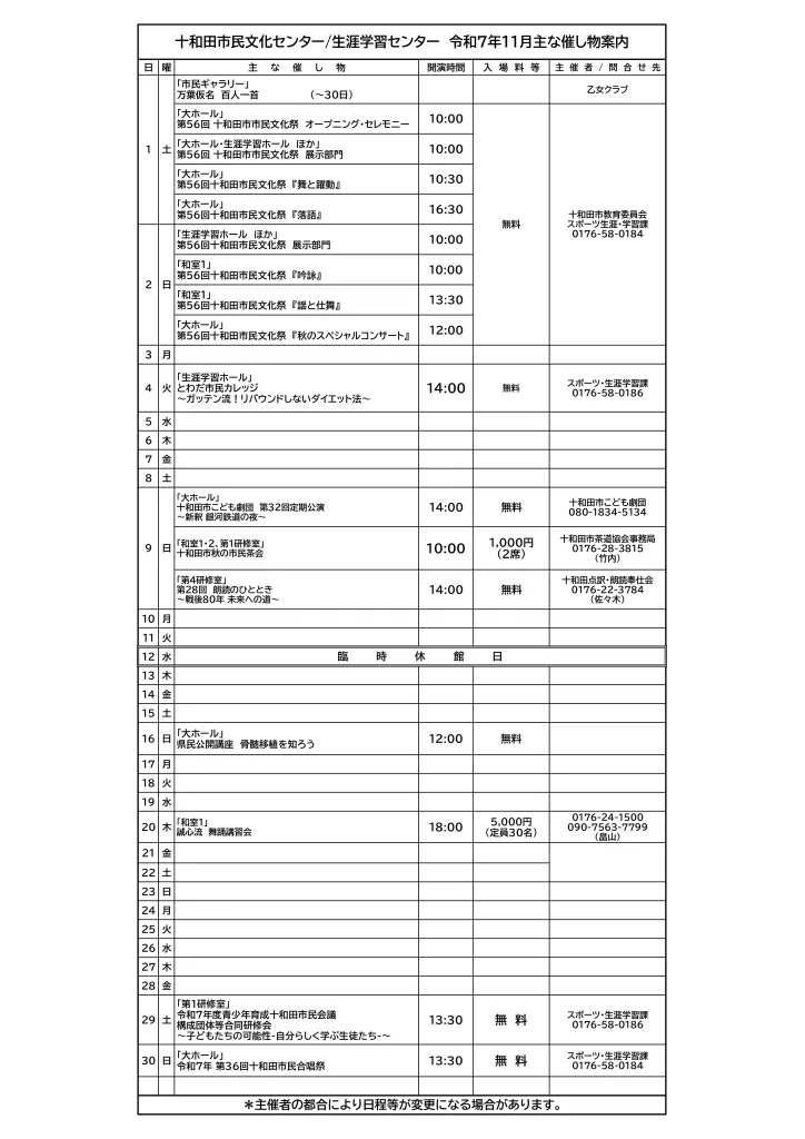 2025年11月イベントスケジュール 月間催物案内2025年11月催し物案内 2025.09.012025.11.07 📅 2025年11月のイベント情報につきましては、随時更新しておりますので、 ぜひご確認ください。