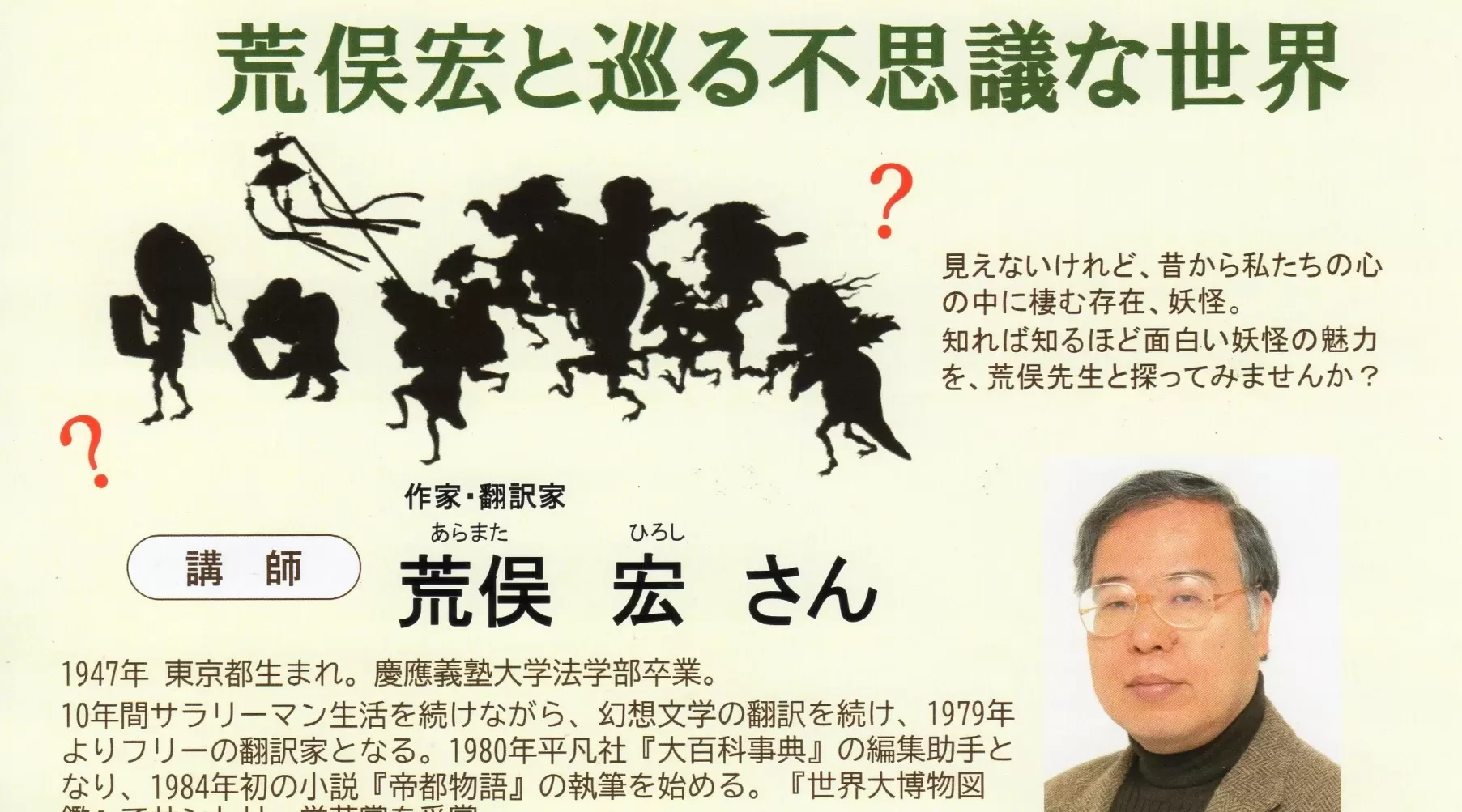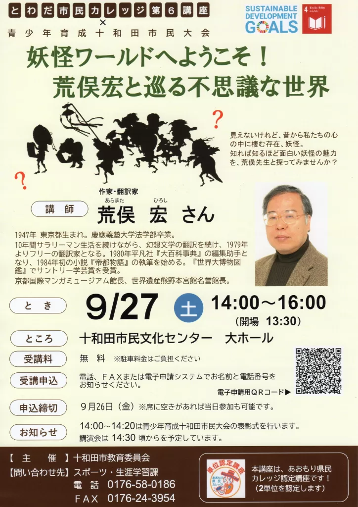 250927 とわだ市民カレッジ第6講座 妖怪ワールドへようこそ!荒俣宏と巡る不思議な世界 ・過去のイベント情報 2025.09.092025.10.04 日時:2025年9月27日(土) 講演会は14:30頃からを予定 場所:十和田市民文化センター 大ホール 受講料:無料(電話、FAXまたは電子申請システムでお申し込みください)