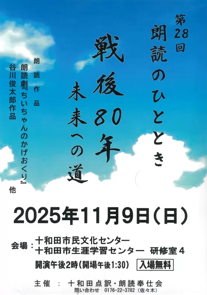 第28回 朗読のひととき 戦後80年 未来への道 ・過去のイベント情報 2025.10.042025.10.08 日時:2025年11月9日(日)開場13:30 開演14:00 場所:十和田市生涯学習センター 第4研修室 入場料:無料