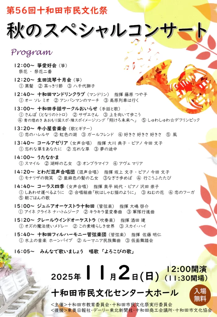 251101-02 第56回十和田市民文化祭 ・過去のイベント情報 2025.10.24 日時:2025年11月1日(土)~2日(日)10:00~17:00 場所:十和田市民文化センター・十和田市生涯学習センター 舞台部門:大ホール・和室1 展示部門:生涯学習ホール・第1研修室
