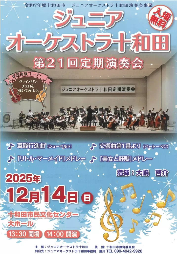 251214 ジュニアオーケストラ十和田 第21回定期演奏会 ・過去のイベント情報 2025.10.26 日時:2025年12月14日(日) 開場13:30 開演14:00 場所:十和田市民文化センター 大ホール 入場料:無料 ※楽器体験コーナーあり