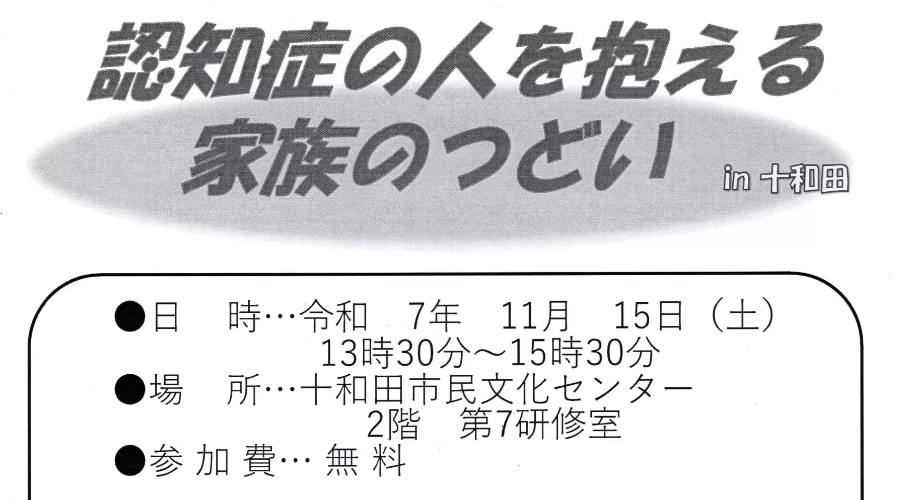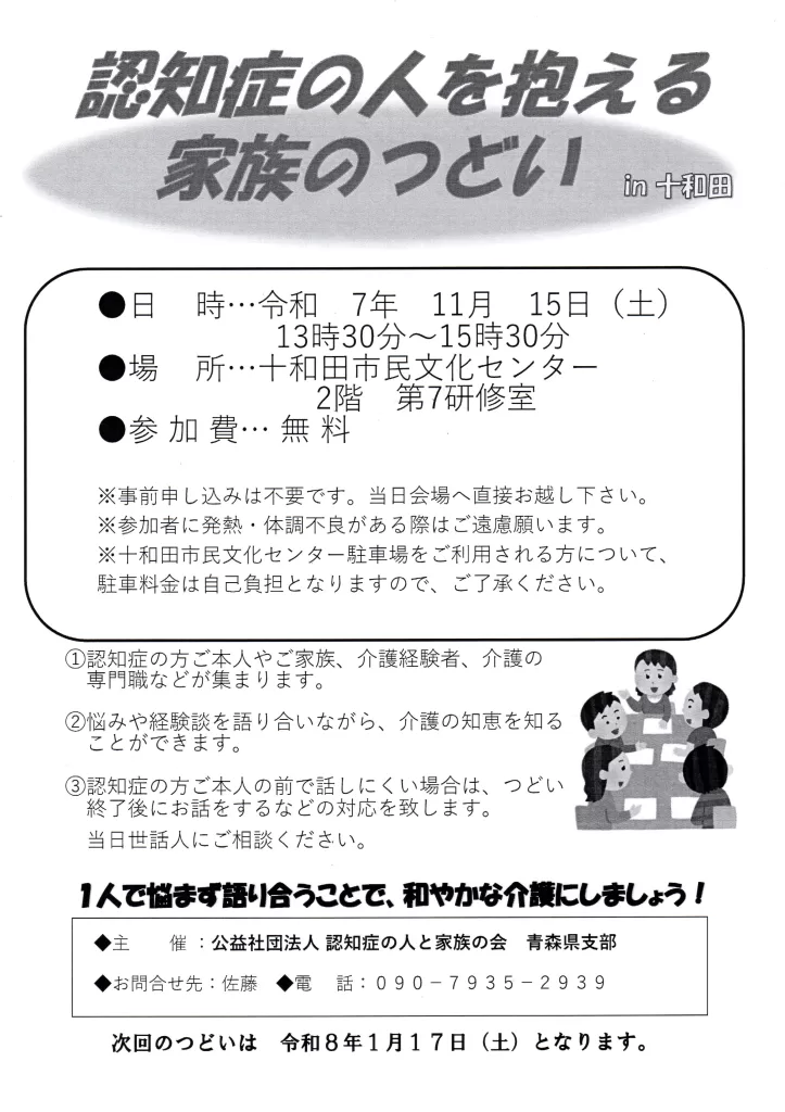 251115 認知症の人を抱える家族のつどい in十和田 ・過去のイベント情報 2025.10.29 日時:2025年11月15日(土)13:30~15:30 場所:十和田市民文化センター・生涯学習センター 第7研修室 参加費:無料