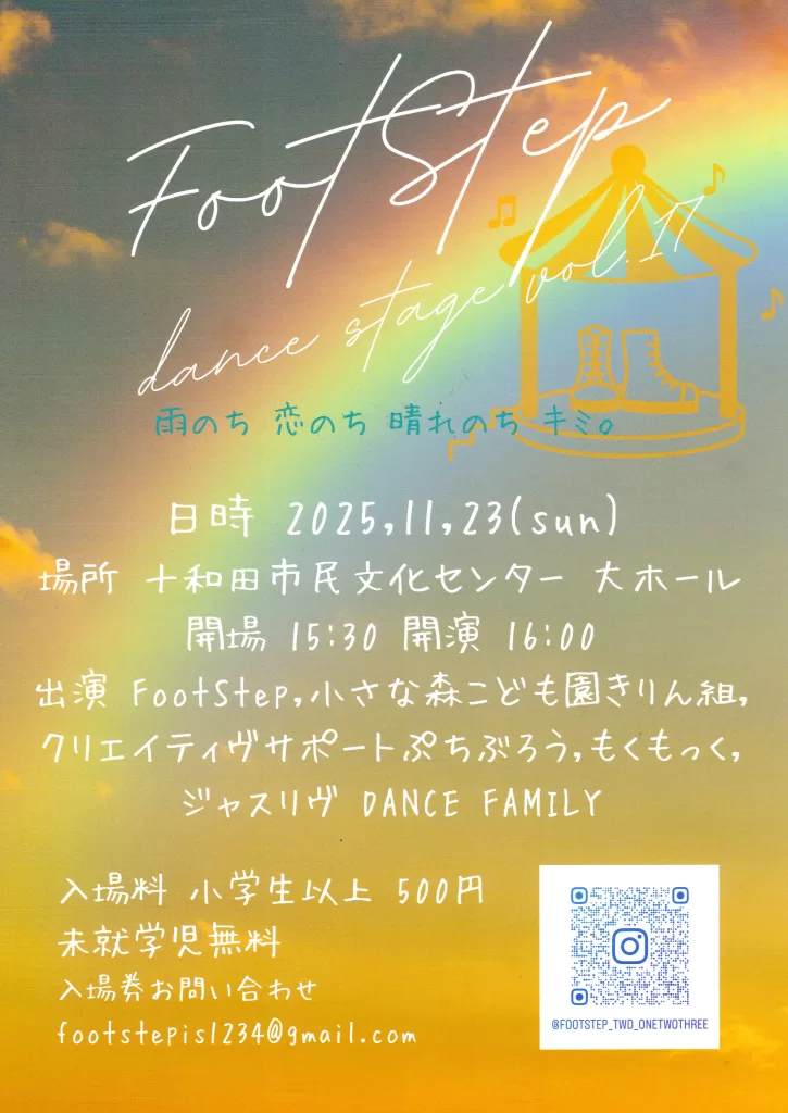 251123 FootStep dance stage vol.17 ・過去のイベント情報 2025.11.06 雨のち 恋のち 晴れのち キミ。 日時:2025年11月23日(日) 開場15:30 開演16:00 場所:十和田市民文化センター 大ホール 入場料:小学生以上500円 未就学児無料