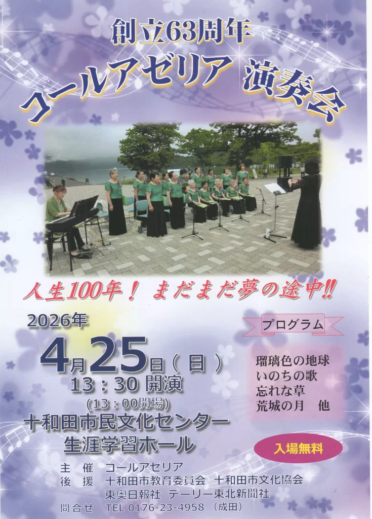 260425 創立63周年 コールアゼリア演奏会 イベント情報 2026.02.06 日時:2026年4月25日(日) 13:00開場 13:30開演 場所:十和田市民文化センター・十和田市生涯学習センター 生涯学習ホール 入場料:無料