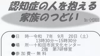 ・過去のイベント情報 251115 認知症の人を抱える家族のつどい in十和田 日時:2025年11月15日(土)13:30~15:30 場所:十和田市民文化センター・生涯学習センター 第7研修室 参加費:無料 2025.10.29 ・過去のイベント情報