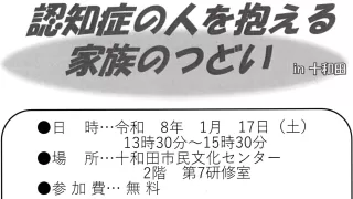 イベント情報 260117 認知症の人を抱える家族のつどい 日時:2026年1月17日(土) 13:30~15:30 場所:十和田市民文化センター・十和田市生涯学習センター 2階 第7研修室 参加費:無料 2025.12.18 2026年1月開催イベント情報